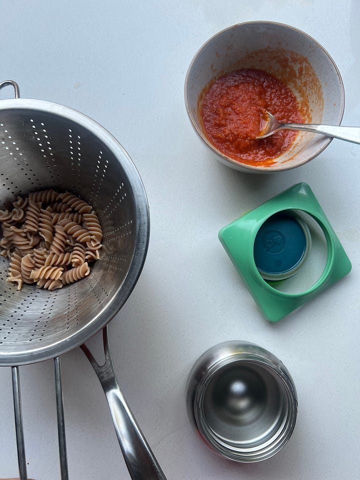 Manter opções no freezer garante lancheiras variadas com agilidade. David adora levar macarrão para a escola e eu congelo molho de tomate em forminhas de silicone para descongelar de manhã uma porção individual e garantir uma marmitinha de macarrão para o almoço. Essa versão de macarrão express também é um grande sucesso na lancheira do David porque fica pronto mais rápido que um macarrão instantâneo.