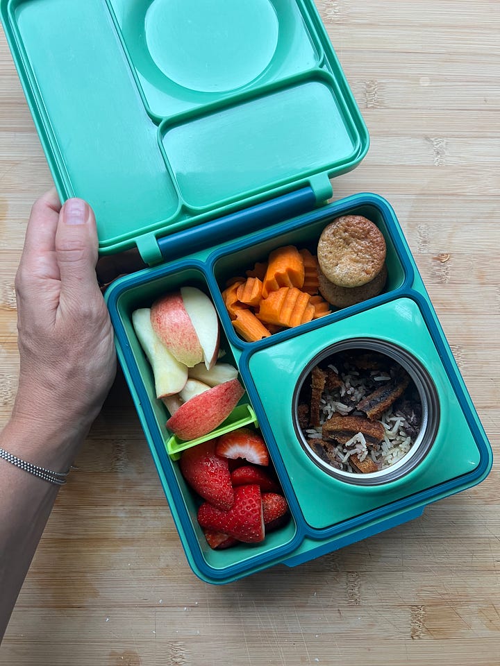 Eu sempre mando uma ou duas frutas, um vegetal, e variações de um bolinho, waffle de pão de queijo, queijo, biltong e a marmita com o almoço. A combinação de marmitas é variada porque continuo implementando a herança da introdução alimentar de armazenar arroz, feijão, carne e frango em forminhas de gelo, congelado em cubinhos e na noite anterior transfiro a combinação desejada para um recipiente de vidro, deixo na geladeira e na manhã seguinte coloco água fervente no recipiente de inox, aqueço a comida no micro-ondas e transfiro a comida quente para o potinho aquecido para conservar a comida quentinha por mais tempo.