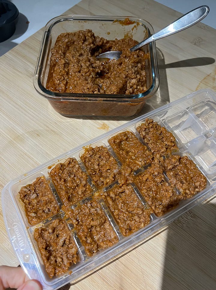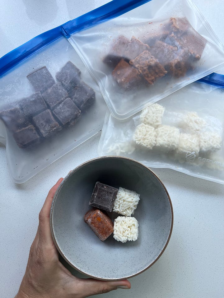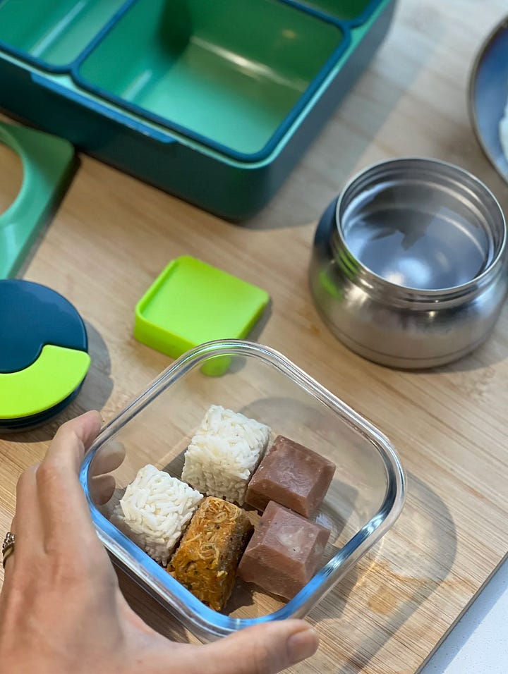 Não precisa existir uma megaprodução de refeições exclusivamente para a lancheira para garantir uma diversidade de opções, eu, por exemplo, reservo uma pequena porção dos preparos que eu faço para armazenar nas forminhas, e isso não gera nenhum trabalho extra e garante um estoque completo. Clique aqui para assistir o vídeo onde mostro como armazeno os cubinhos.