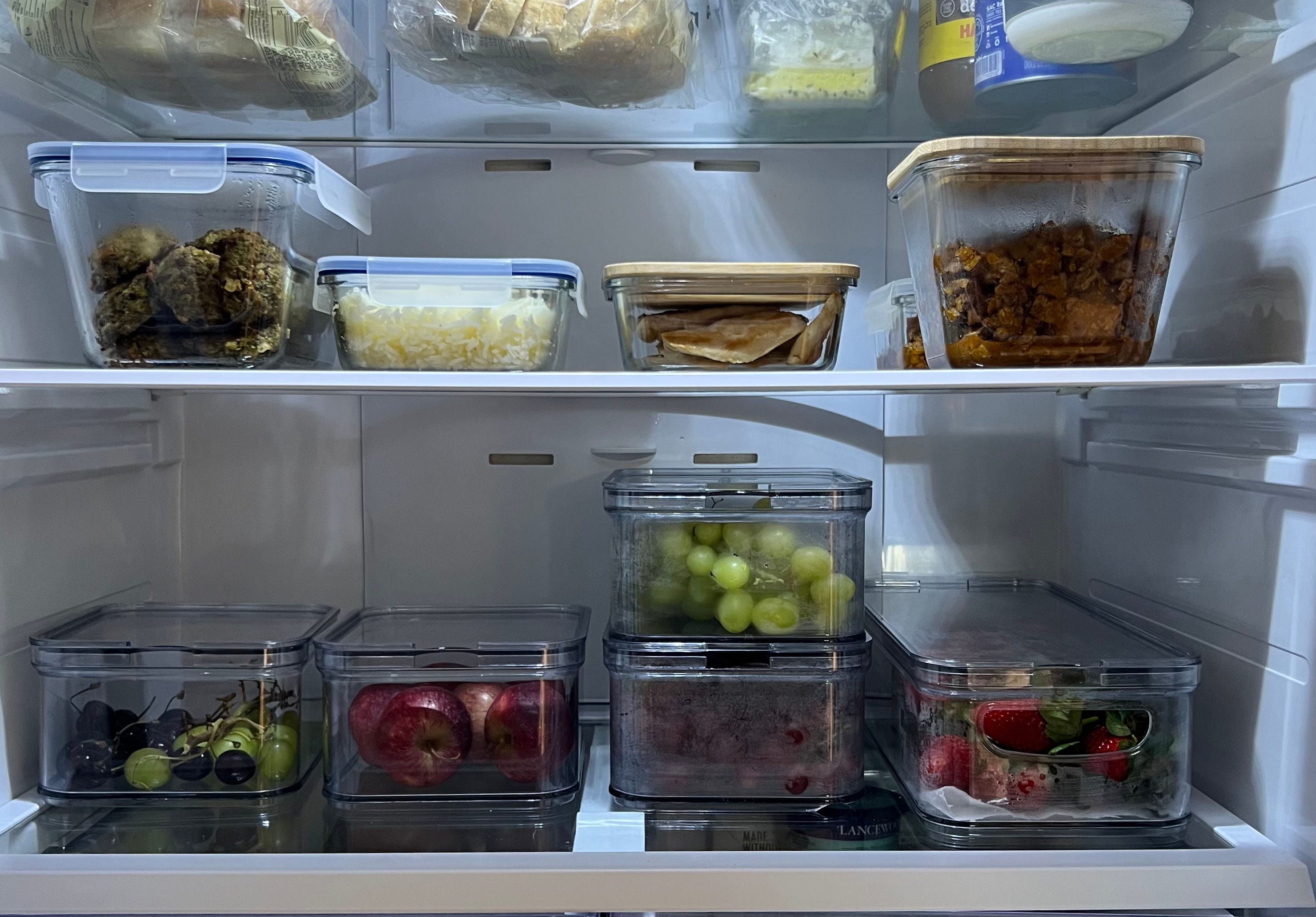 Armazenar as frutas na geladeira já higienizadas é uma excelente maneira para agilizar a composição das lancheiras durante a manhã. É simplesmente escolher a fruta do dia com muita praticidade. Clique aqui para ver um vídeo de como eu higienizo morangos.
